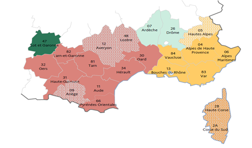 - Aude, Gard, Haute-Garonne, Gers, Hérault, Pyrénées Orientales, Tarn et Tarn-et-Garonne pour la région Occitanie ;