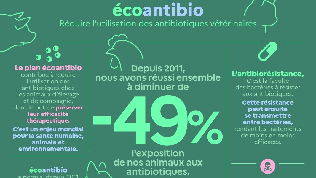 Le plan Écoantibio contribue à réduire l'utilisation des antibiotiques chez les animaux d'élevage et de compagnie dans le but de préserver leur efficacité thérapeutique.
