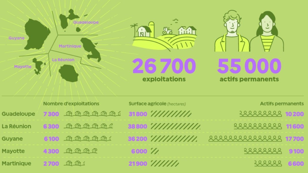 La Guadeloupe, la Martinique, la Guyane, la Réunion et Mayotte comptabilisent 26 700 exploitations pour un total de 55 000 actifs permanents.