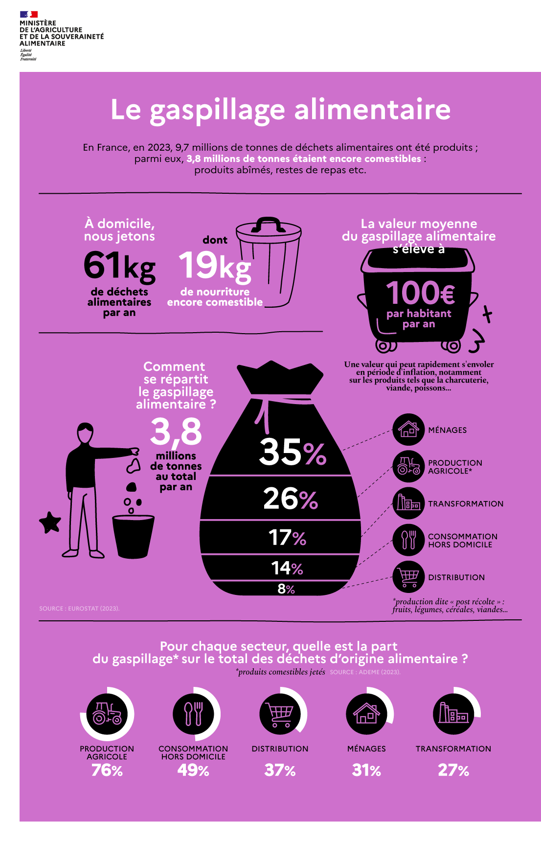 En France, en 2023, 9,7 millions de tonnes de déchets alimentaires ont été produits ; parmi eux, 3,8 millions de tonnes étaient encore comestibles : produits abîmés, restes de repas, etc.