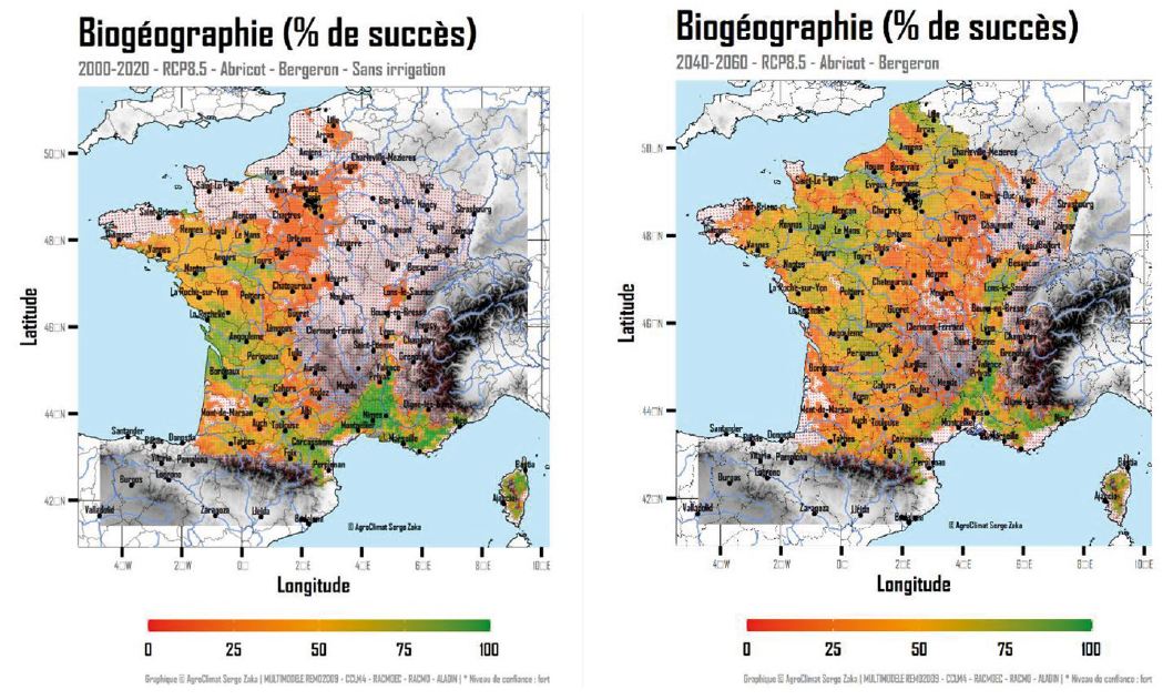 Figure 1 – Two maps of metropolitan France compare the economic production potential of the Bergeron apricot variety between the periods 2000–2020 and 2040–2060, without irrigation, under an RCP 8.5 climate scenario corresponding to a high level of global warming. The economic production potential provides a success rate percentage for developing a variety as a main crop. Thus, green areas on the map correspond to a potential above 70%, indicating that the variety is economically viable. Conversely, yellow and red areas indicate that developing the variety as a main crop is not economically viable. The maps indicate that the potential for Bergeron apricot declines in the south and gradually shifts northwards by 2040–2060, particularly to the northern Rhône Valley and in the Pays de la Loire region.