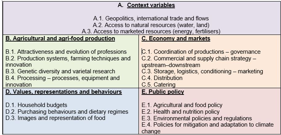 Figure 2 – A table presents the system of variables used to analyse past and present trends in the fruit and vegetable sectors and to construct development scenarios. The main variables influencing these sectors concern the context in which they operate (e.g. geopolitics, natural resources), agricultural and agri-food production, the economy and markets (e.g. marketing strategies, market access), the values, representations and behaviours of households and farmers, as well as public action. These factors vary in contrasting ways across each of the scenarios developed.